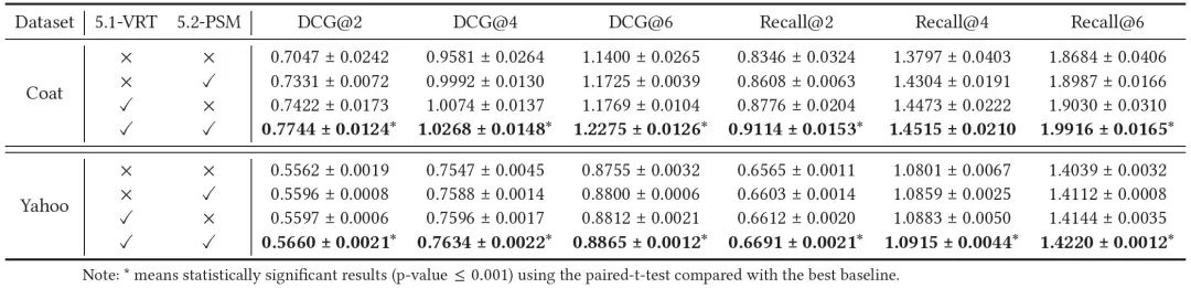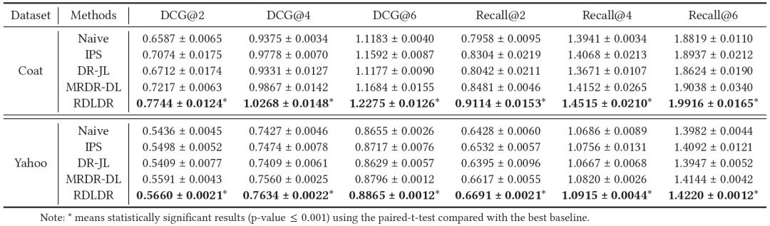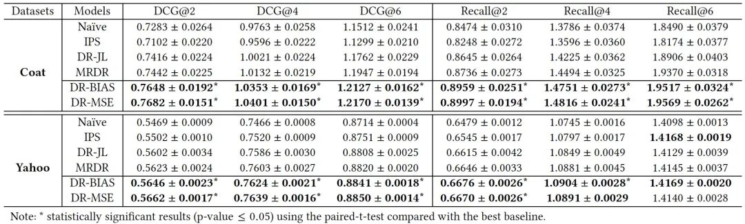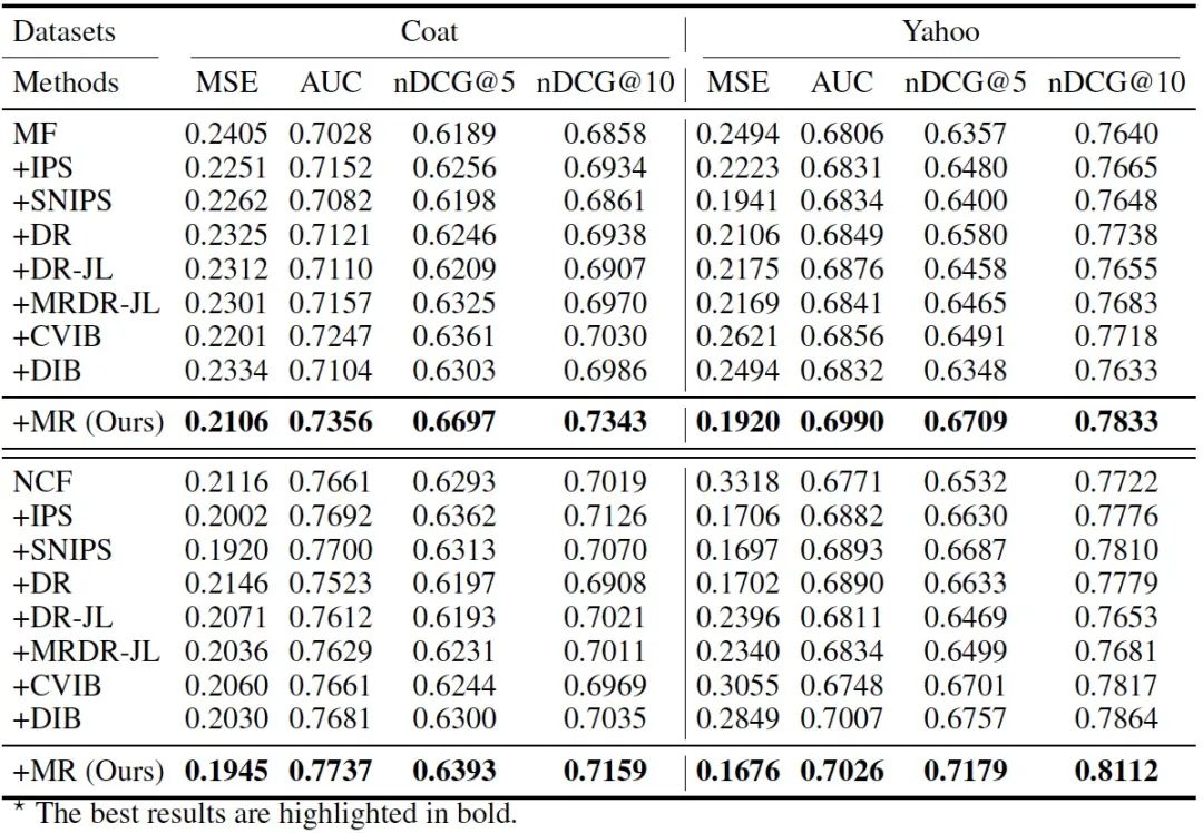 【在Coat和Yahoo!R3的MAR数据上,以MF为基模型,DCG@2,4,6和Recall@2,4,6的评价指标(最好的结果用黑体表示)】