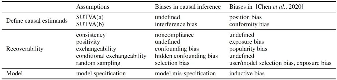然而,一个统一的因果分析框架还没有建立起来。一方面,现有的推荐系统的因果分析方法对感兴趣的科学问题缺乏明确的因果和数学表述,导致该领域普遍存在许多模糊的因果概念,阻碍了因果推荐方法的发展。需要澄清许多混乱的问题:到底是什么被估计,为了什么目的,在什么情况下,通过什么技术,在什么合理的假设下。另一方面,推荐系统的观察数据的一个明显特征是存在各种偏差,这是得出因果结论的主要障碍。然而,推荐系统中偏差的正式因果定义仍然不明确,尽管各种偏差已经被发现并以描述性的方式提出。由于缺乏对因果问题和偏差类型的正式阐述,很难清楚地讨论去偏方法的理论属性、优点和缺点。也很难清楚地解释这些方法背后的假设。因此,很难开发新的去偏算法。