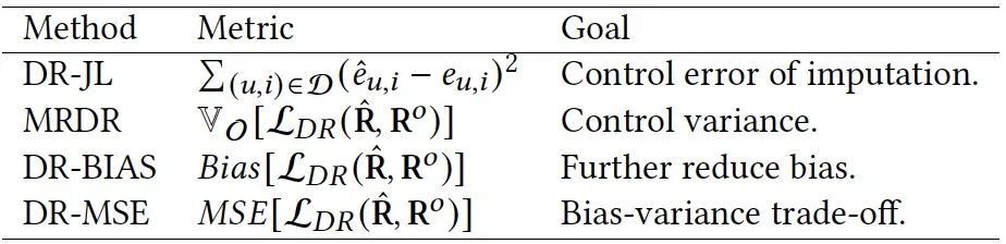 尽管DR方法通常与EIB和IPS估计器相比更有优势,但仍有一些担忧。通过对DR估计器的理论分析表明:偏差、方差和泛化界都取决于由倾向得分的倒数加权的误差推断模型的误差偏离。这是一个令人担忧的结果,因为在未点击的事件中,倾向于使用大的倾向性加权,而由于选择偏差和数据稀少,误差推断模型的误差偏差在未点击的事件中很可能是不准确的。这表明,在未点击事件中,在不准确的推断误差下,偏差、方差和泛化边界可能仍然很大。最近,一些方法,主要包括双重稳健联合学习