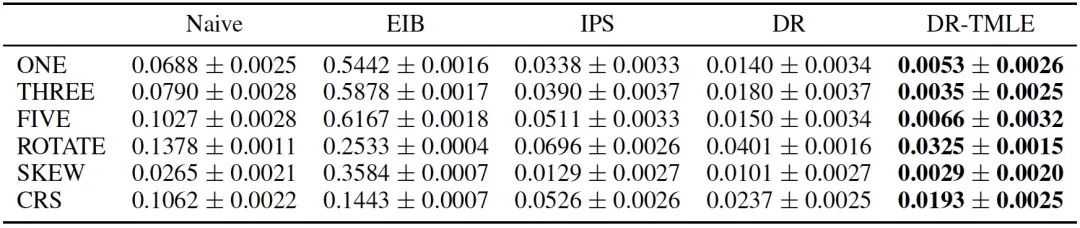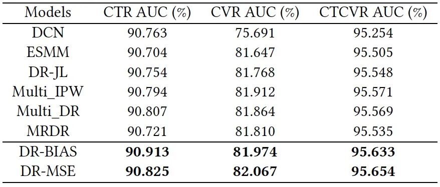 估计器。一个DR估计器将具有双稳健的特性,如果推断误差或倾向性得分都是准确的,它可以保证对CVR的无偏估计。与EIB和IPS方法相比,DR方法在总体上有更好的表现。