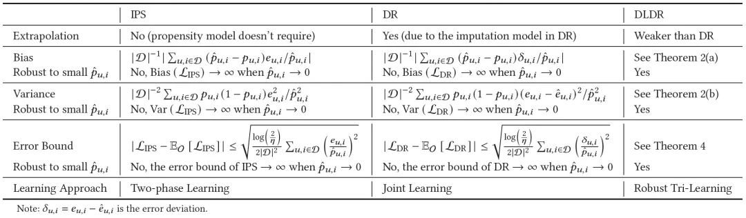 【比较IPS、DR和提出的DLDR估计器的外推依赖性、偏差、方差、误差界和学习方法】