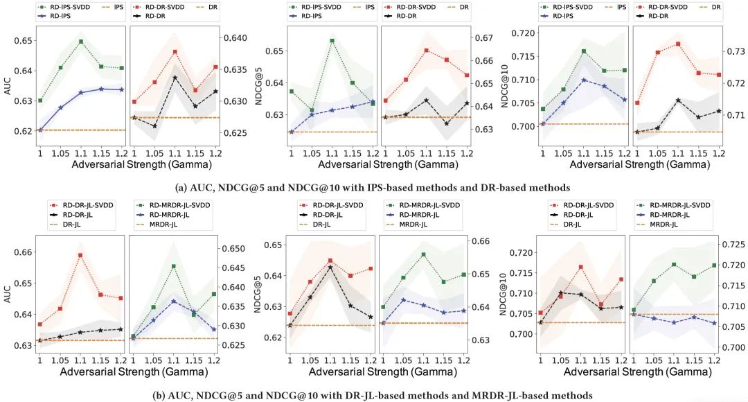 图题:在MAR数据上,不同对抗强度的AUC、NDCG@5和NDCG@10。上面是IPS和DR方法,下面是基于DR和MRDR的联合学习方法。