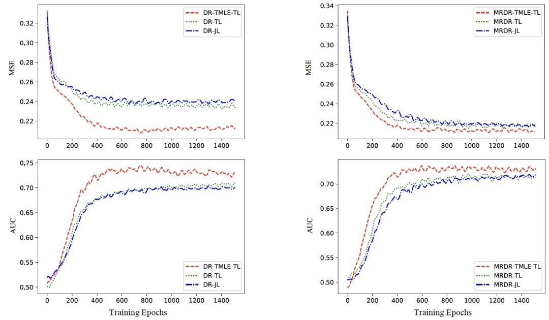 图题:TMLE-TL、TL和JL的MSE(上)和AUC(下)的比较,DR(左)和MRDR(右)作为误差推断模型,其中TL跳过了TMLE-TL中的目标步骤