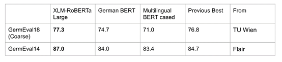 在本文中,我们重点介绍XLM-R模型的关键要素,并探讨其在德语中的性能。我们发现,在三个流行的德语数据集上,它的表现优于我们的单语德语;虽然在 GermEval18 (仇恨语音检测) 上与 SOTA 性能相当,但在 GermEval14 (NER) 上显著优于以前的方法。