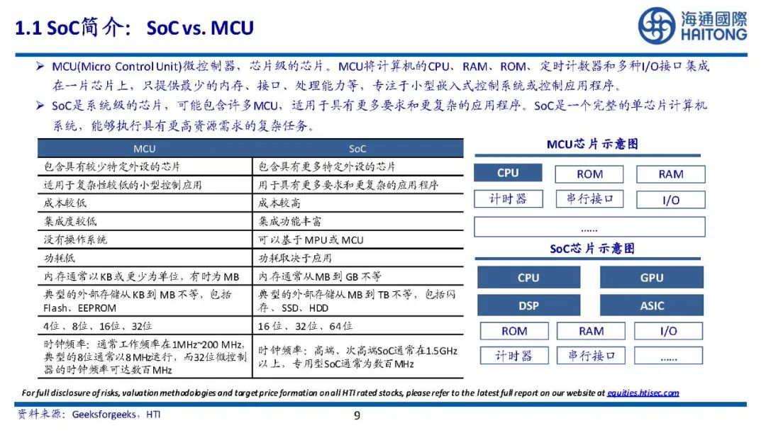 随着半导体工艺的发展,传统MCU已经不能完全满足智能终端的需求,SoC应运而生,凭借其性能强、功耗低、灵活度高的特点,使单芯片能够完成完整的电子系统。SoC在移动计算(例如智能手机和平板电脑)和边缘计算市场中非常普遍。它们也常用于嵌入式系统,如WiFi路由器和物联网。