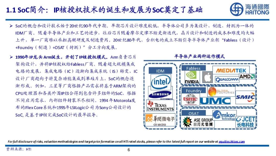 SoC的概念和设计技术始于20世纪90年代中期。早期芯片设计难度较低,半导体公司多为集设计、制造、封测为一体的IDM厂商。随着半导体产业和工艺的进步,往后芯片随着摩尔定律不断更新迭代,晶片设计和制造的成本和难度均大幅上升,单一厂商难以承担高额研发及制造费用。20世纪80年代,台积电的成立不断引导半导体产业朝“Fabless(设计)+Foundry(制造)+OSAT(封测)”分工方向发展。