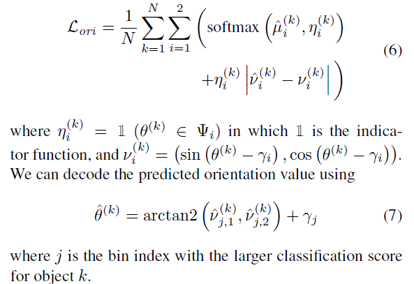 这里的方向是绕 z 轴的角度,设定了两个 bin,分别是 [-7π/6,π/6] 和 [-π/6,7π/6],每个 bin 有四个变量,两个用作 softmax 分类,两个用作角度回归。其中分类是判定属于哪种 bin,角度回归是相对于 bin 中心的 sin 和 cos 偏差。