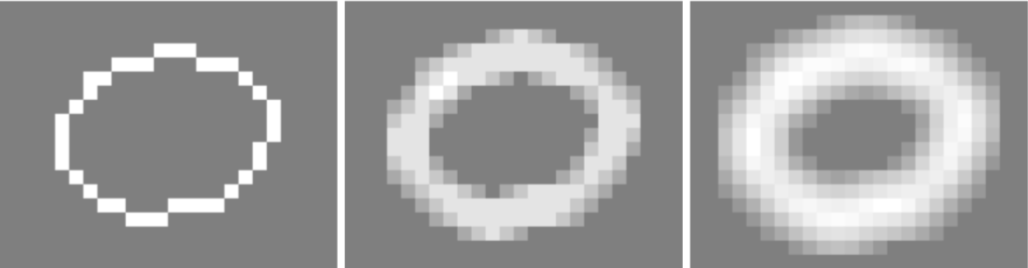 另外,还引入了 AAAI 2020 中针对 CenterNet 这类算法框架提出的训练策略改进 TTF [2] ,为了提供更多高质量的正样本。由于 CenterNet 所采用的高斯核只考虑了中心点和与之距离的因素,在 x,y 方向共用一组标准差,生成了圆形的高斯 mask: