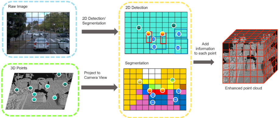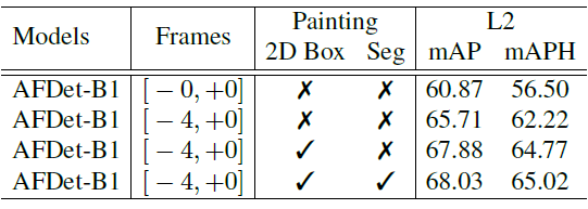 在数据增强环节,除了一些基本的平移旋转操作,作者在每帧中加入了 6 个车辆、8 个行人和 10 个自行车,并沿着 z 轴做随机反转。特别地,作者团队借鉴 CVPR 2020 中 Pointpainting 的方式,引入了颜色信息,用来增加类别区分度和更丰富的伪点云信息: