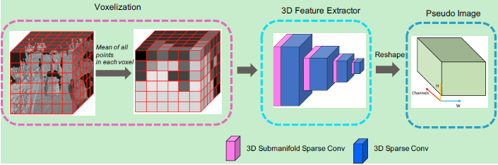 其中 3D 特征提取部分的 SPConv3D 卷积是由几个 submanifold 卷积和一个稀疏卷积层构成 [6] ,其目的是防止网络稀疏性下降: