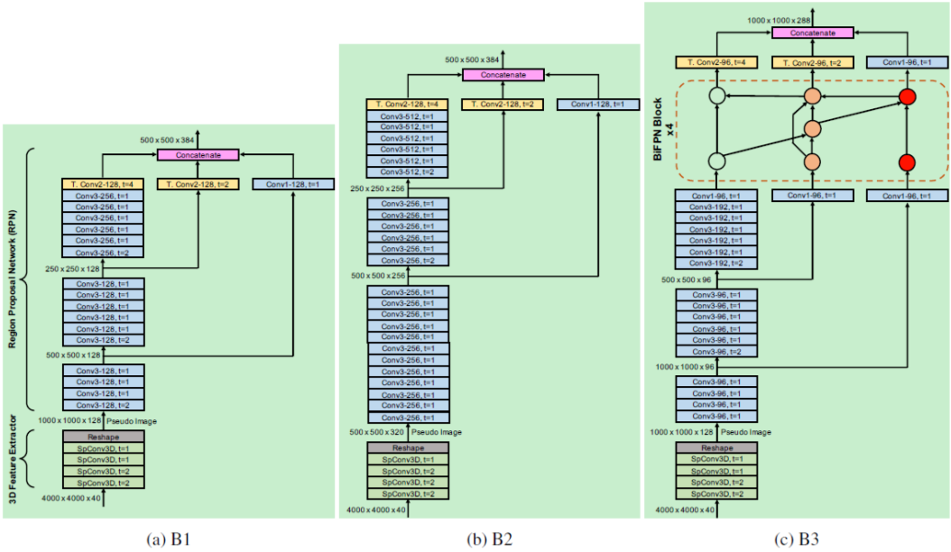 而中间的 backbone 和 necks 部分则是换成了更加复杂的形式,包含有两种 3D 特征提取器和三种 RPN 网络,组合成了三种网络框架: