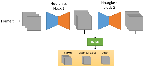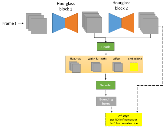 其中 CenterNet 部分,采用了两组 Hourglass104 网络作为 backbone,其中第一组的输出只在训练的时候为提供 auxilliary loss,具体见下图。