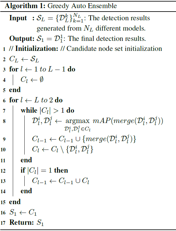 作者团队将不同检测框架和不同推理策略进行组合,通过二叉树来构建贪婪式的自动 ensemble 框架: