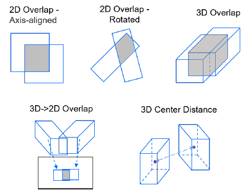 而对于 2D 和 3D 目标的 IOU 距离计算则是: