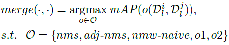 每组模型的评价由验证集上的 mAP 指标为准,模型结果的融合则是基于不同的 nms 处理方式,这里作者用了五种后处理方式: