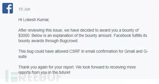 本文分享的是一个Facebook CSRF漏洞,用Gmail或G-Suite账户来验证新创建Facebook账户时存在的CSRF令牌验证机制漏洞,攻击者利用该漏洞,可在验证新创建Facebook账户时,以最小用户交互方式用受害者邮箱验证其注册的Facebook账户,实现间接CSRF攻击。漏洞最终获得Facebook官方$3000美金奖励。