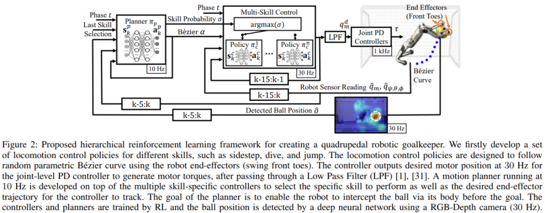 为了完成这个挑战,研究团队提出了一个分层无模型强化学习 (RL) 框架。该框架包含一个针对不同运动技能的多个控制策略,覆盖了目标的不同区域。