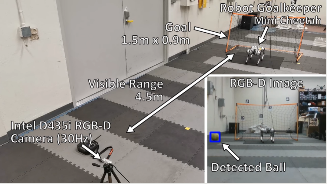 Mini Cheetah 防守的球门宽 1.5m,高 0.9m,球(3 号)从约 4m 外踢出,球被外部跟踪,然后 Mini Cheetah 拦球。让这么小的机器狗完成拦球动作,其表现是令人印象深刻的。