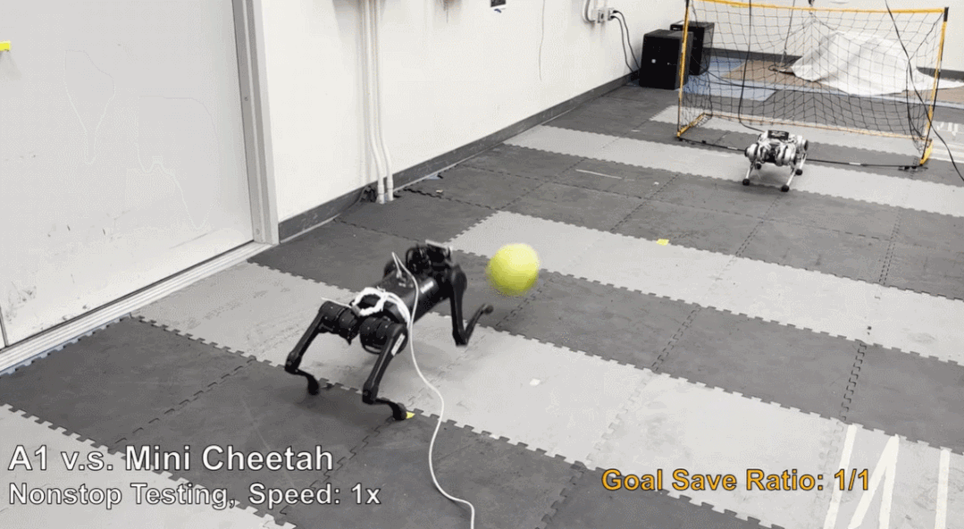 有趣的是,该研究还尝试让一只机器狗踢球,另一只当守门员,两只机器狗自己也能玩挺好: