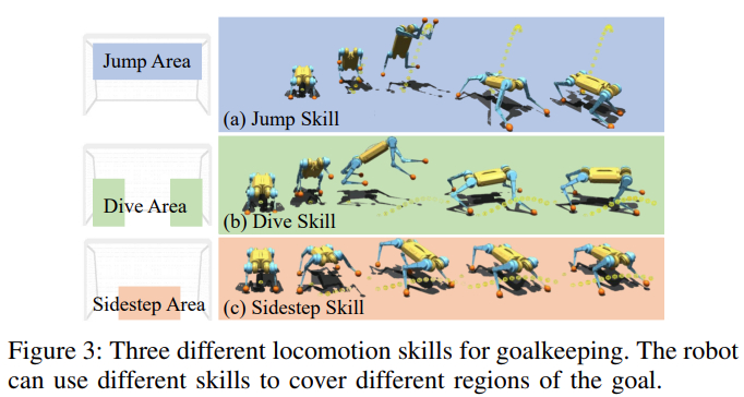 完成上述过程,还需要训练 Mini Cheetah 掌握一套有用的守门员技能,例如 Mini Cheetah 需要掌握在地面附近和靠近地面的地方对球进行侧身拦截、掌握俯冲到达球门的下角技术、跳跃到球门的顶部和上角。做完这些动作,Mini Cheetah 都可以恢复并最终安全着陆。每个技能的参考动作都是手动编程的,在模拟中进行训练,然后直接迁移到机器人上。