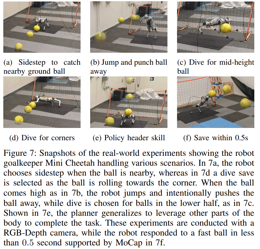 该研究在 MIT 2019 年提出的 Mini Cheetah 四足机器人上部署了上述 RL 框架,实验表明这种 RL 框架能够让四足机器人有效拦截现实世界中快速移动的球。