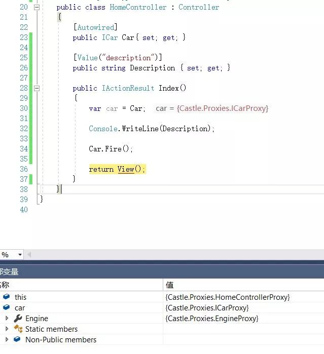 从上图可以看到,我们的控制器,ICar和Engine全部都是动态代理类,注入正常。
