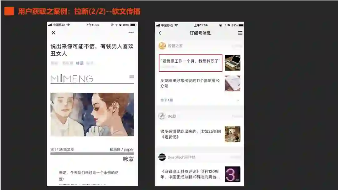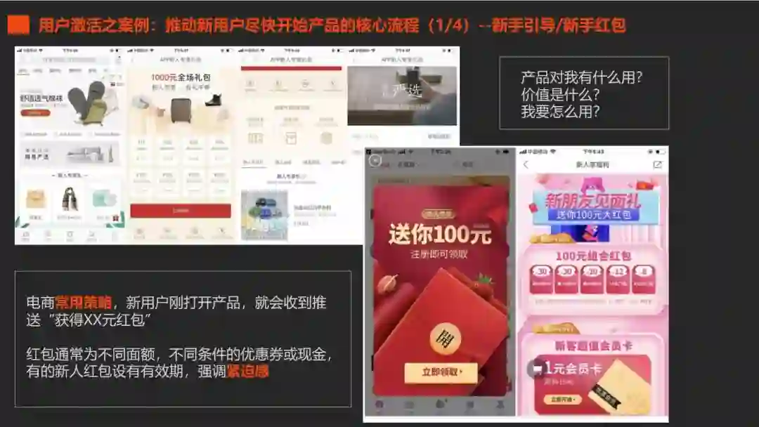 这里举了几个电商在用户获取的详细举措,例如红包刺激、营销活动,降低了用户的“付出门槛”。比如自媒体的软文传播,用标新立异的题目获得用户眼球,产生自传播,正是我们俗称的“标题党”来吸引一波种子用户。