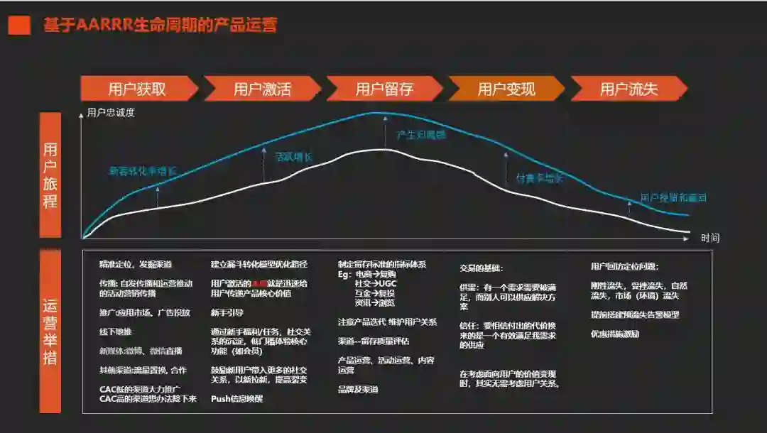 而基于具体的场景,产品运营对技术有了更高更科技的需求,也不断地推进技术的进步。在《运营之光》的书中,对于运营有详细的定义——主要两个方面,第一是获取用户并且转化用户让其付费,第二是让用户长期与产品平台发生关系。那么就引入了“生命周期”的概念。