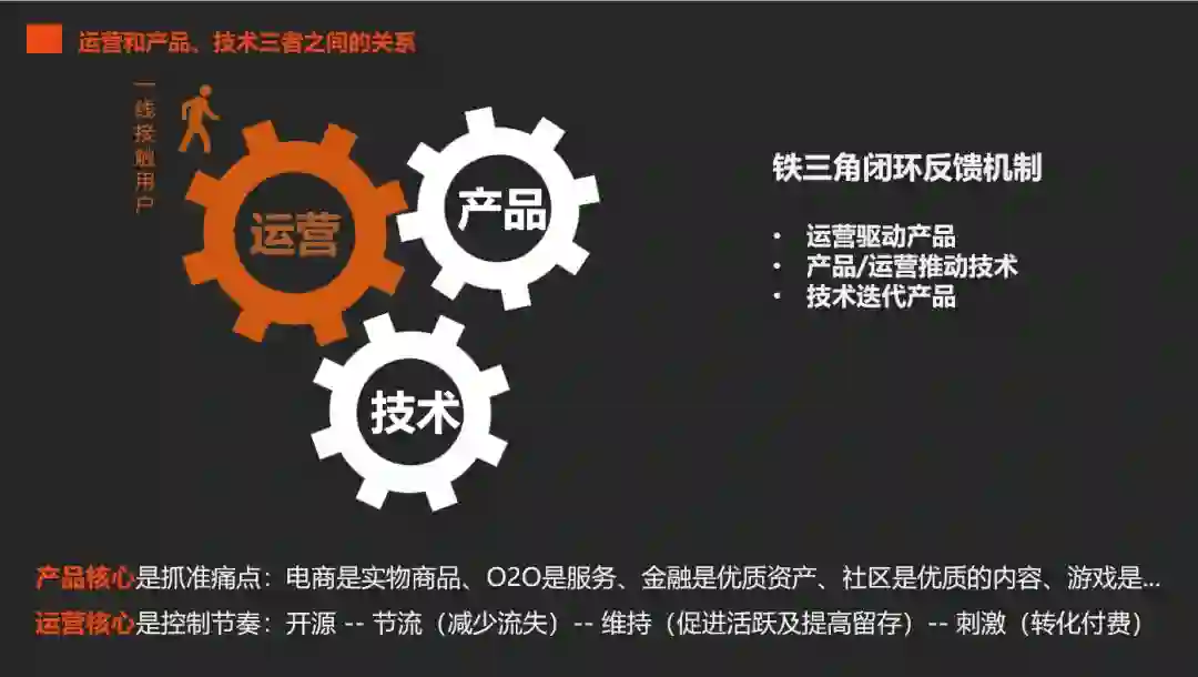 对于互联网企业而言,大致将其分为3大板块——产品、运营和技术,这三者是一种铁三角闭环反馈机制的职能。产品由0到1创造产品,解决了用户的核心痛点。运营基于产品一线接触用户,搜集用户的反馈将信息传递给产品进一步改进产品的设计。