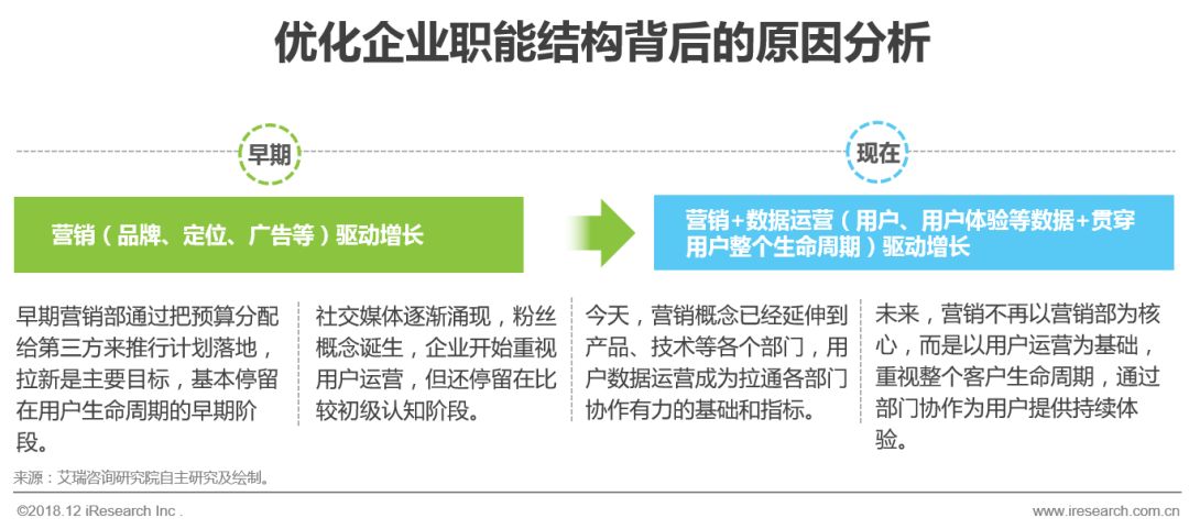 艾瑞分析认为:在职能结构调整上,无论是否设立增长团队这样的部门,都要试图打破筒仓模式,连接营销部门与产品研发、数据部门的合作与沟通。同时,做以数据为驱动力和产品研发的方式来带动公司业务增长的战略调整,最后在职能添加上,尝试数据分析、产品研发、用户运营三个方向的岗位添加。