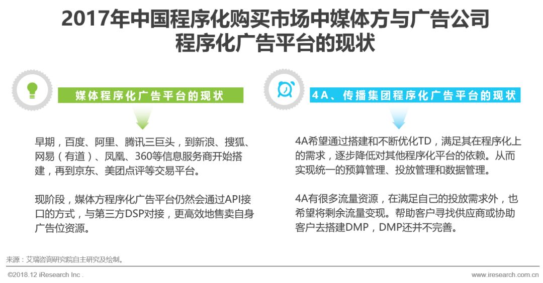 在程序化购买产业链中,媒体由于同时具备流量资源和客户资源,还想获得更大话语权和利润,因此开始自建程序化广告平台。而4A及本土大型广告传播集团则希望通过自建的程序化广告平台实现统一的预算管理、投放管理和数据管理,也在试图涉足这一块业务。