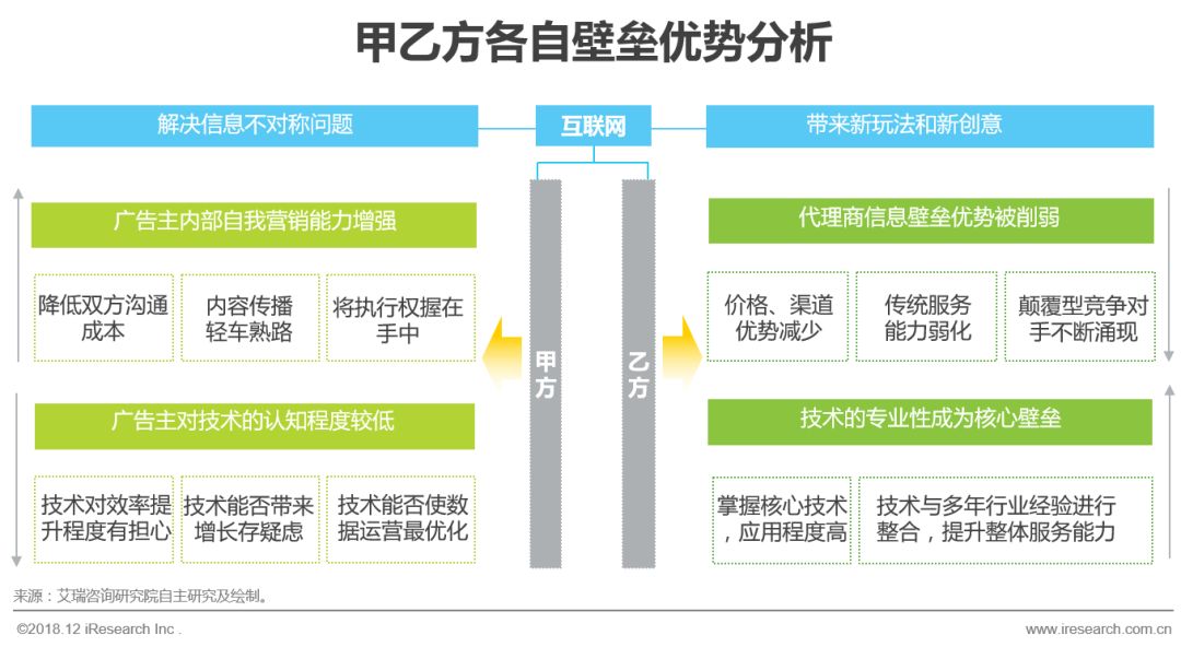 对于大多数公司没有实践去乙方的模式,从企业角度去看,一方面受到企业规模限制,人力成本不足以支持公司完成所有的营销传播;一方面是企业所要进行的营销传播更适合代理商去执行,并能保证效果。从代理商角度去看,信息壁垒不再占有优势,技术的专业性成为了他们的新壁垒,而对技术的理解和应用也是广告主目前最为薄弱的地方,因此代理商在产业链中的价值依然很大。