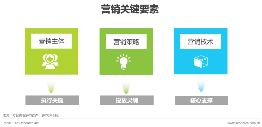 艾瑞分析认为:每种营销理论在具体的实践当中,为营销带来的作用有所区别,但其中起到关键作用的要素却相同。艾瑞归纳营销过程当中的关键要素有三个:营销主体是营销行为的执行关键,营销策略是贯穿投放行为的灵魂,营销技术则是核心支撑,三个关键要素互相配合,协同打造优质营销效果。