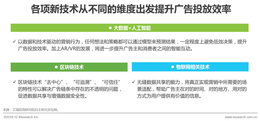 广告技术化时代正在到来,加速企业营销升级:从本质上讲,营销正在经历一场技术革命,移动互联网时代的营销是以互联网技术为基础来实现个性化生产和传播。未来,大数据+人工智能、区块链、物联网对于营销的战略性意义最大,将全面提升投放效率,使营销生态系统更加优质透明。
