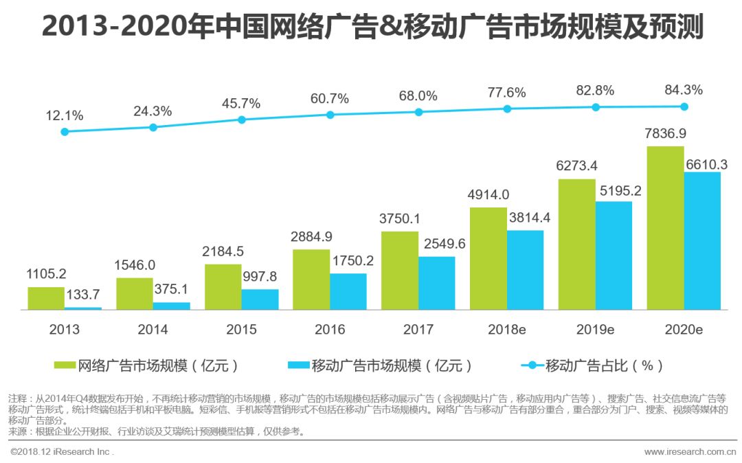 移动终端早已成为我们生活的一部分,全生态全功能的打通为移动营销提供了更多价值场景,与此同时,移动广告产业链不断完善,推动着移动广告规模的快速增长。2017年移动广告规模达2549.6亿,占总体网络广告比例近70%,预计2018年,移动广告规模会达到3814.4亿,占总体网络广告的比例接近80%,同时,2020年预计这一比例将达到84.3%,将持续引领网络广告市场发展。
