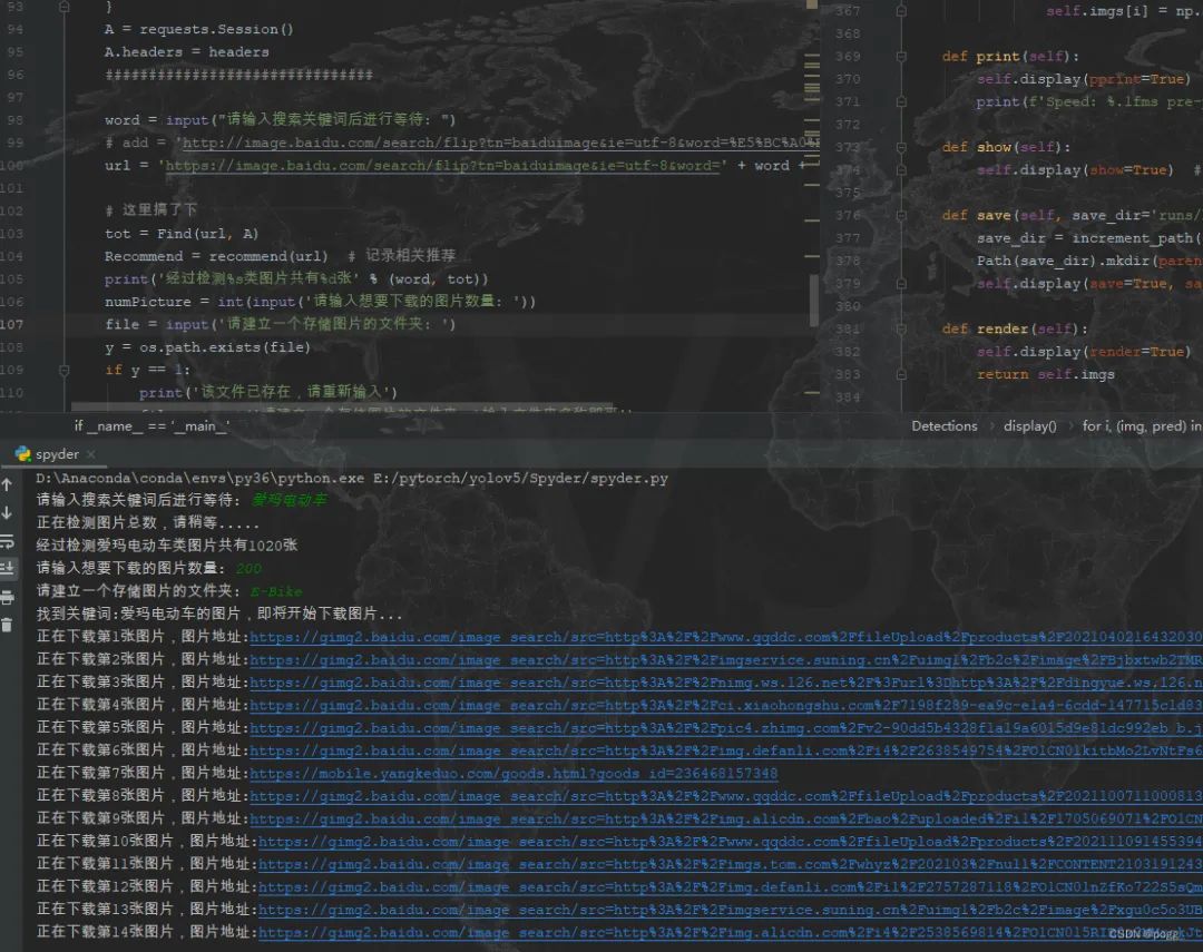 这是数据库构建最主要的工作之一,由于没有钱购买数据库,那么就得从零开始搭建数据集,而网络爬虫是最主要的方式。网络爬取数据通过借鉴网络爬虫脚本进行修改,对市面上常见的电动车进行调研,发现最常见的电动车品牌有雅迪、小刀、艾玛、绿源等,种类共包括电摩托、锂电池电动车、折叠电动车和脚踏电动车等,依次进行爬取,如下所示: