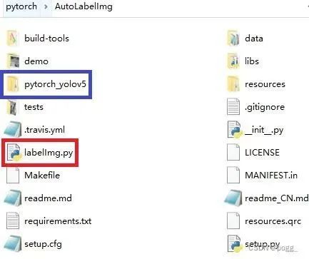 如上所示,最重要的文件包有两个,一个为pytorch_yolov5,(蓝框),一个为labelImg.py(红框),一个是后续需要配置的文件包,一个是主函数文件。