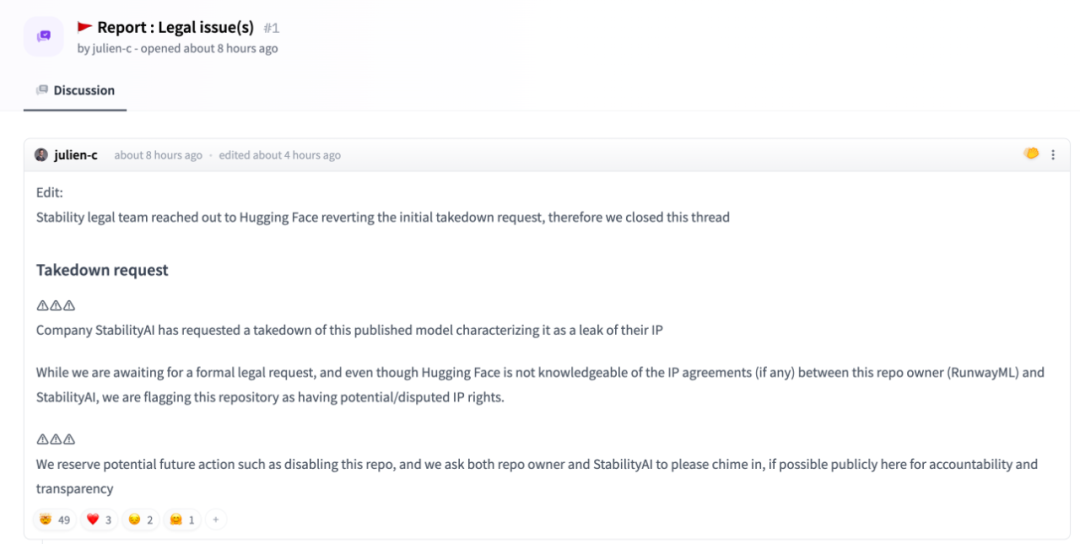 在 Hugging Face 平台 Runway 发布的 Stable Diffusion v1.5 版本帖子上,Hugging Face 首席技术官 Julien Chaumond 提示了一个法律问题:Stability AI 法务团队要求 Hugging Face 删除发布的新版本 Stable Diffusion,且声称是侵犯知识版权。