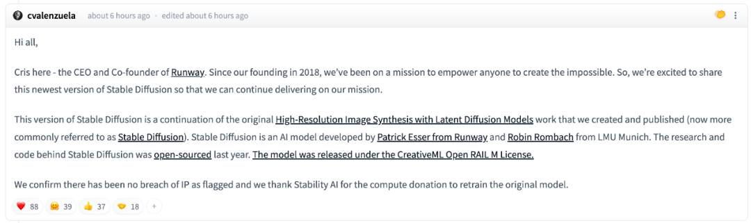 在大家迷惑的时候,Runway 的 CEO、联合创始人也下场解释了,表示自家发布 Stable Diffusion 1.5 版本是没问题的,是对「他们」创造、发布的原始研究的更新。此外,他再次强调了:这个研究的作者们来自 Runway ML 和慕尼黑大学,研究和代码去年也已经开源。