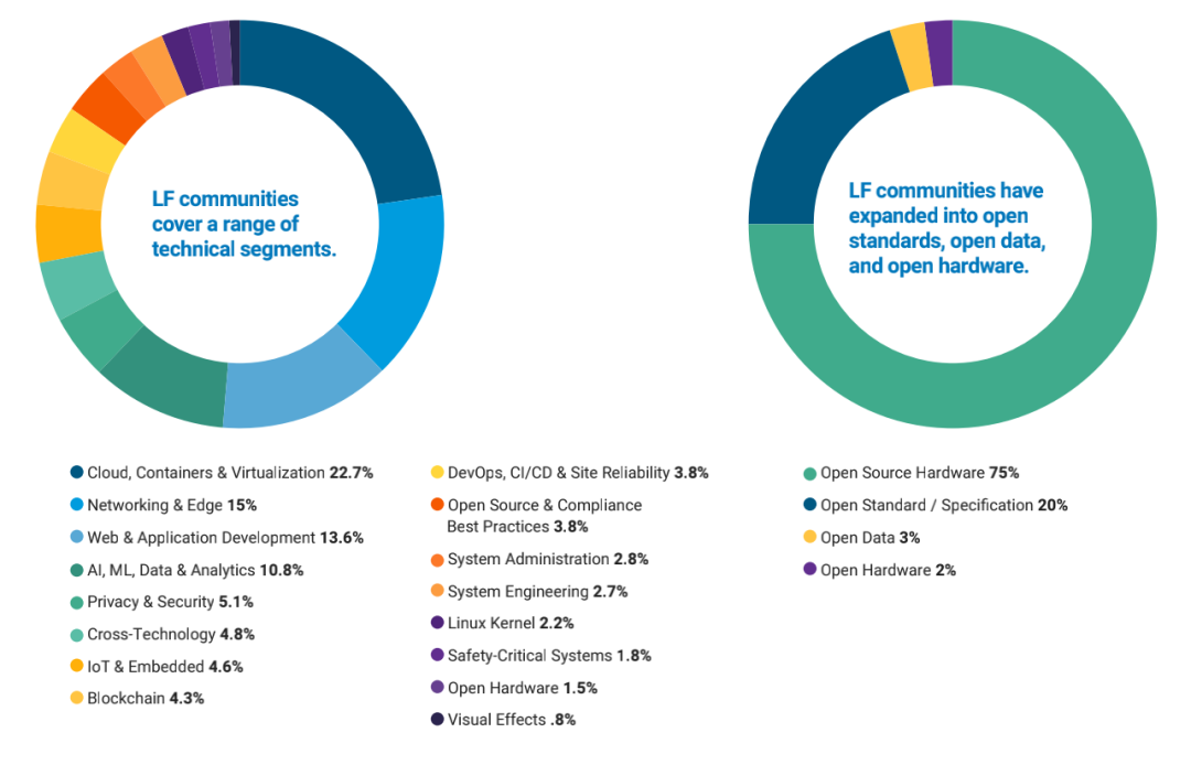 Linux 基金会社区本身关注的方向有四大类,分别是开源硬件、开放标准、开放数据、开放硬件,占比分别为 75%、20%、3%、2%。