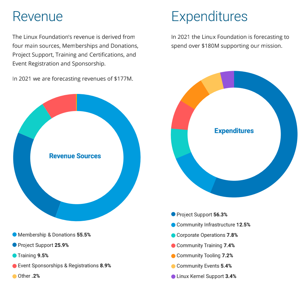 Linux 基金会主要有四个收入来源:会员资格和捐赠、项目支持、培训和认证以及活动注册和赞助。2021 年,预计收入为 1.77 亿美元。但同时,预计支出为 1.8 亿美元,预计亏损 300 万美元。其公布的具体收支情况如下,可以看见其会费和捐赠占总收入的 55.5%,而最大支出项目支持,占比 56.3%: