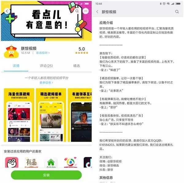 看来“朕惊视频”是小米家的没错了。据介绍,朕惊视频是一个专为年轻人打造的短视频平台,汇聚海量优质视频,精准算法推荐,丰富的个性化内容定制让你找到有趣、好玩的内容。