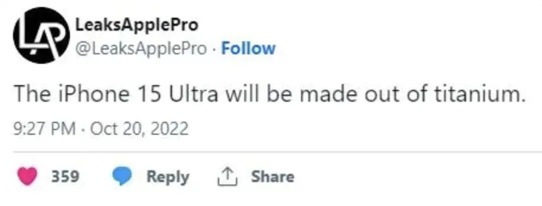 【曝苹果iPhone15 Ultra将采用钛金属外壳】LeaksApplePro 爆料,苹果将为 iPhone 15 Ultra 提供粉丝们梦寐以求的钛合金外壳。此前苹果已在 iPhone 手机中采用不锈钢。(IT之家)