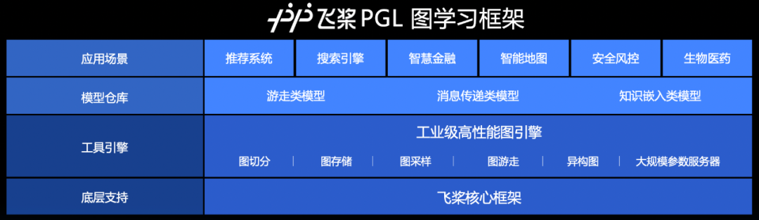 百度深度学习平台飞桨 PaddlePaddle 开源图学习框架 PGL v2.0 版本,全面支持动态图机制,可支持百亿规模大图,用户可以通过 PGL 实现高效而又满足工业应用需求的图神经网络。PGL 支持的百度内外部业务也是遍地开花,全面覆盖推荐系统、搜索引擎、智慧金融、智能地图、安全风控、生物医药等场景。