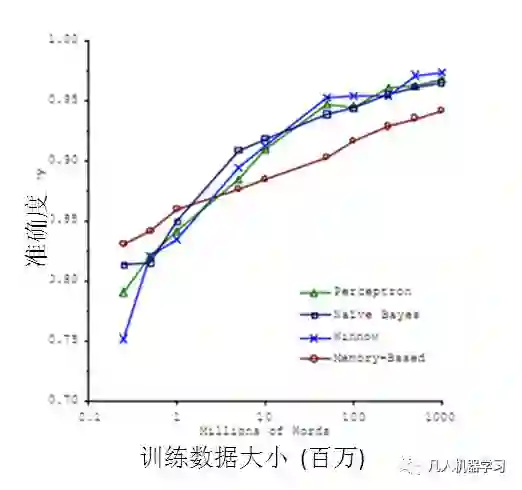 机器学习与大数据的结合产生了巨大的价值。基于机器学习技术的发展,数据能够“预测”。对人类而言,积累的经验越丰富,阅历也广泛,对未来的判断越准确。例如常说的“经验丰富”的人比“初出茅庐”的小伙子更有工作上的优势,就在于经验丰富的人获得的规律比他人更准确。而在机器学习领域,根据著名的一个实验,有效的证实了机器学习界一个理论:即机器学习模型的数据越多,机器学习的预测的效率就越好。见下图: