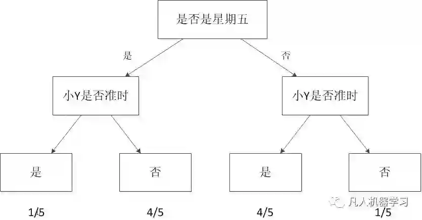 刚才的思考过程我只考虑“频次”这种属性。在真实的机器学习中,这可能都不算是一个应用。一般的机器学习模型至少考虑两个量:一个是因变量,也就是我们希望预测的结果,在这个例子里就是小Y迟到与否的判断。另一个是自变量,也就是用来预测小Y是否迟到的量。假设我把时间作为自变量,譬如我发现小Y所有迟到的日子基本都是星期五,而在非星期五情况下他基本不迟到。于是我可以建立一个模型,来模拟小Y迟到与否跟日子是否是星期五的概率。见下图: