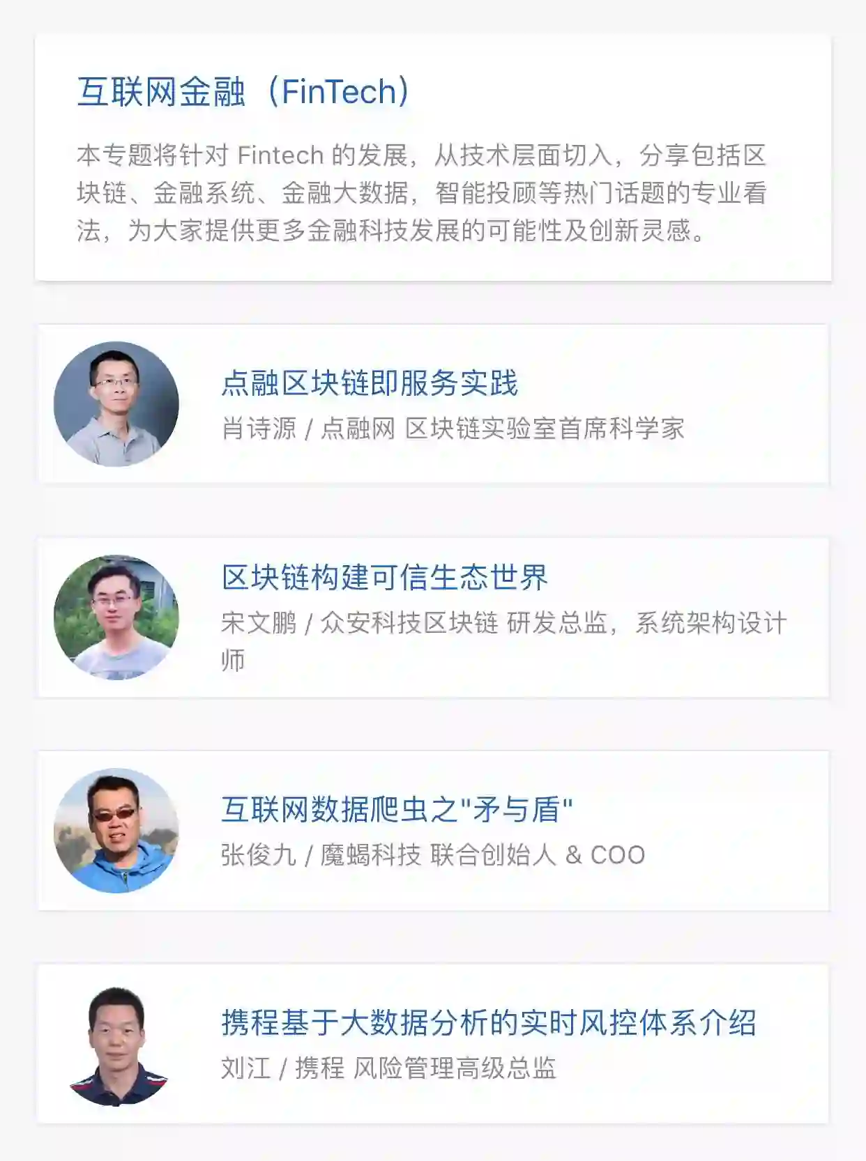 FinTech 这一新兴行业几乎正被应用到金融领域的方方面面。在技术更迭中,初具的行业规范,逐步完善的体系制度,以及如何实现更智能的金融与科技的结合,都是我们需要关注的方向。因此毕鹏老师在互联网金融专题集结众多技术大咖针对 Fintech 的发展,从技术层面切入,分享包括区块链、金融系统、金融大数据,智能投顾等热门话题的专业看法,为大家提供更多金融科技发展的可能性及创新灵感。