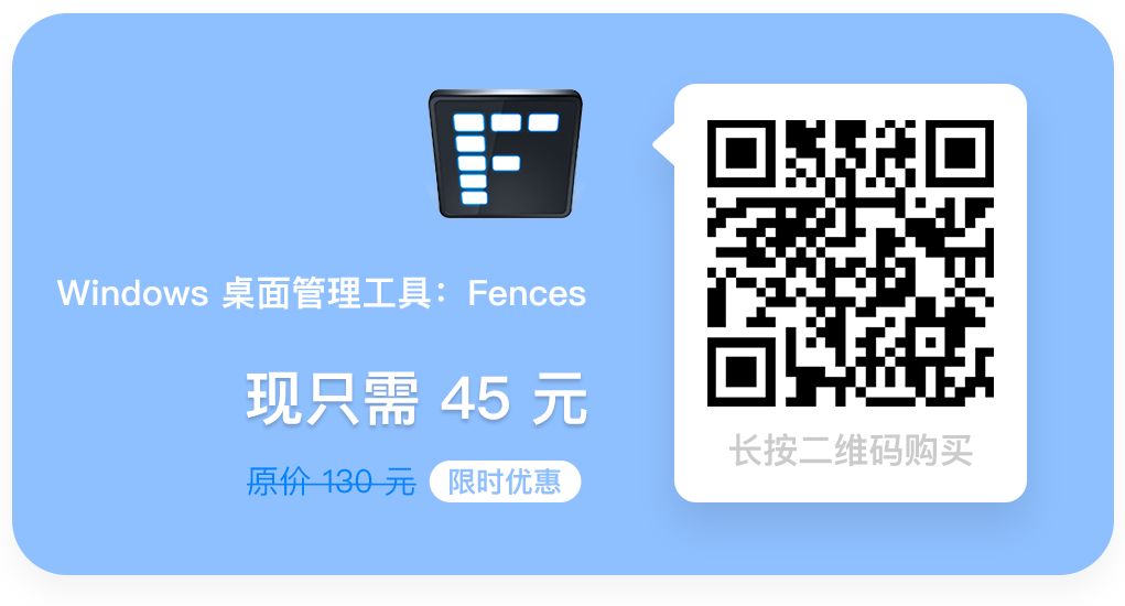 Fences 目前已上架少数派正版软件商城,售价 ¥45,长按二维码即可购买。