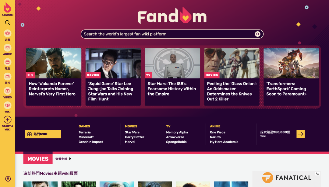 吴立基:Fandom 是一个娱乐内容网站。我们每月全球的用户超过3.5亿,内容页面总数超过4000万页,粉丝自创维基数量超过25万个。Fandom覆盖的内容领域主要包括游戏、电影、电视剧、动漫等,所有都是以娱乐内容为主。这些娱乐内容一部分是粉丝自己建立起来的,另外一部分是由 Fandom 的编辑团队对内容进行创作。无论娱乐内容是主流还是小众,也无论剧情是复杂或简单,Fandom 覆盖了粉丝想要了解的一切。