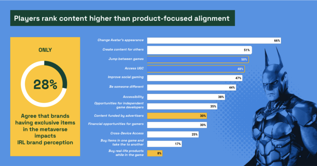 只有28%的玩家称,在元宇宙中拥有商品的品牌将改变他们在现实生活中的看法